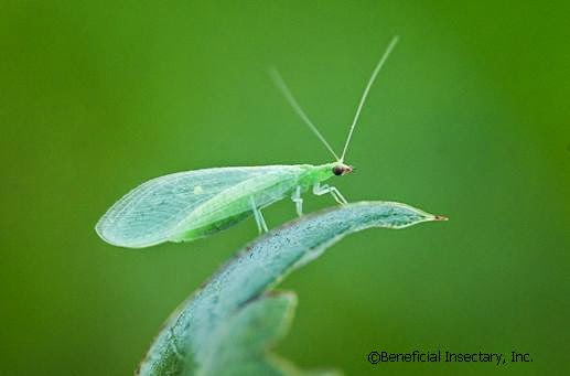 Don't let its tiny size fool you! The lacewing mouth parts are used to pierce and suck body juices out of prey. Before sucking, they inject special saliva containing enzymes the help to pre-digest their prey.