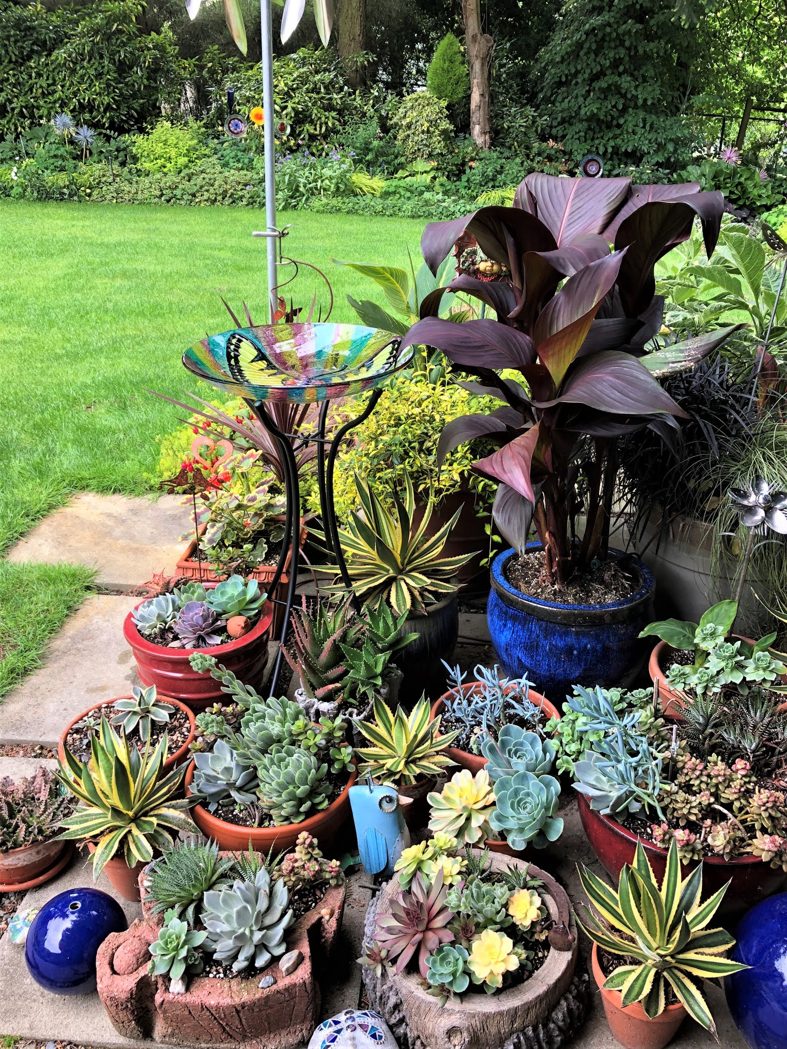 Then we needed to decide where to put it. I wanted to see it when I sit on the patio. I wanted to protect it as much as possible by discouraging a certain cat from jumping up into it.I decided it could rise above our collection of succulents and spiny plants, especially right over that wicked Agave.
